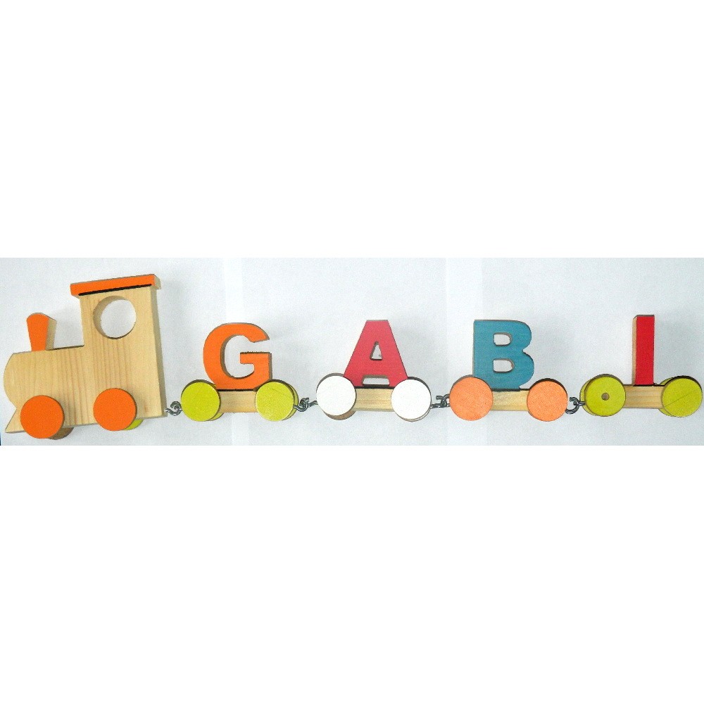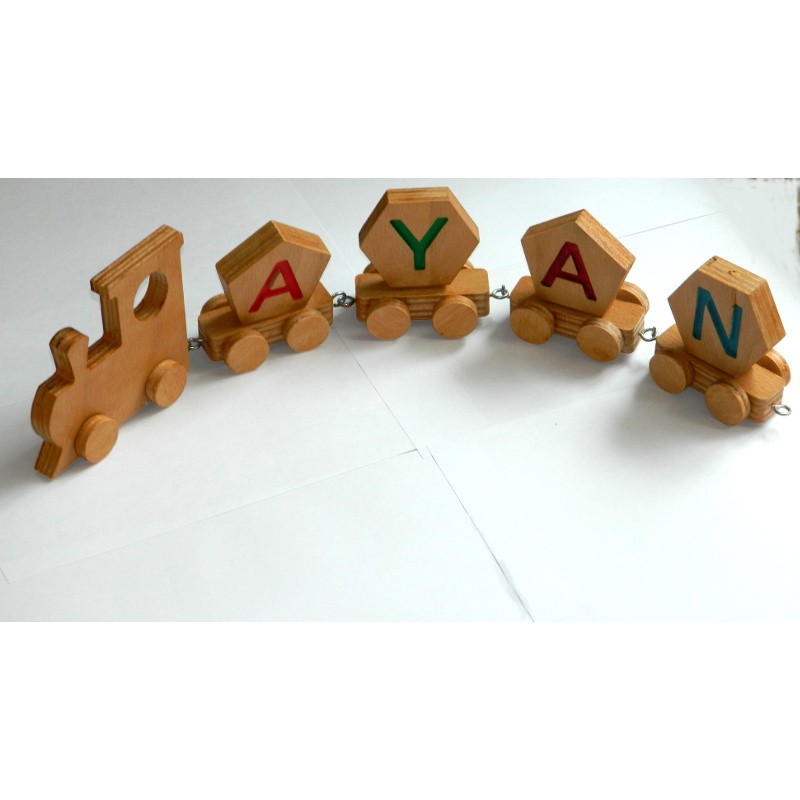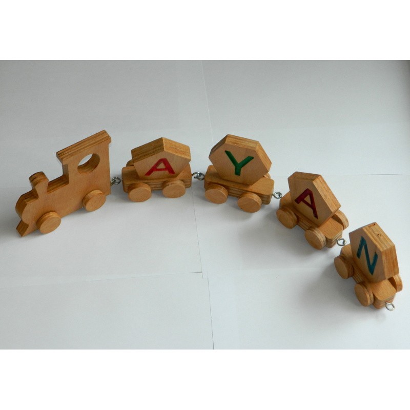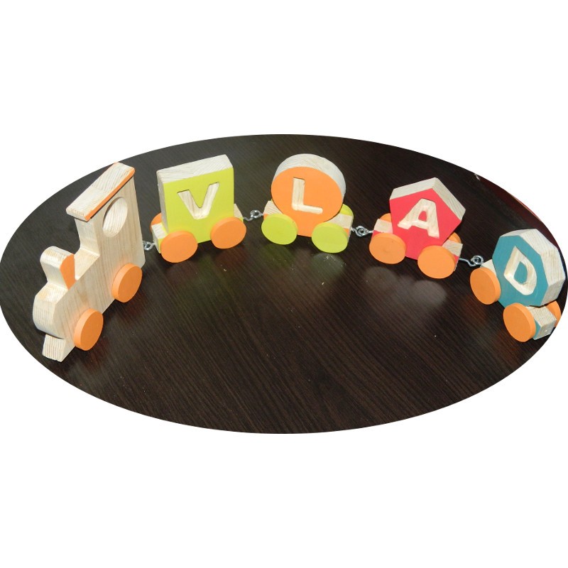 Acest tren din lemn personalizat cu numele copilului ajută copilul sa scrie și să pronunțe numele . Ajută la învățarea alfabetului. Copilul va fi încântat sa se joace cu acest tren!