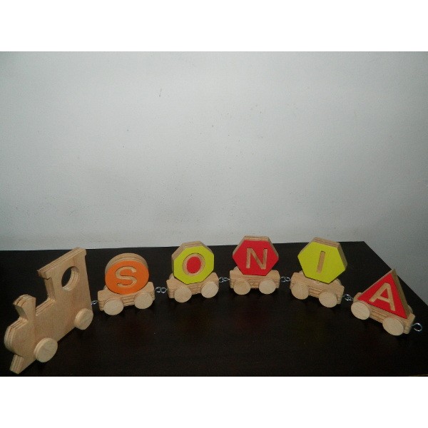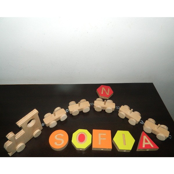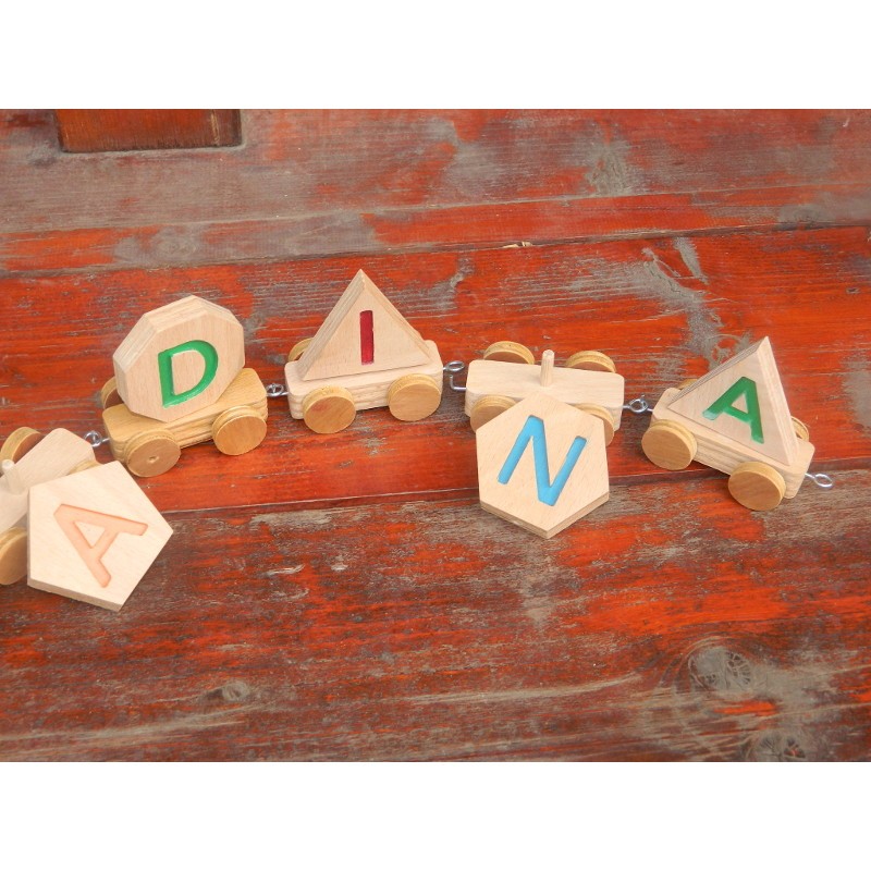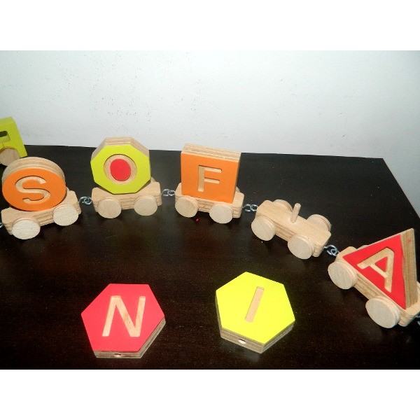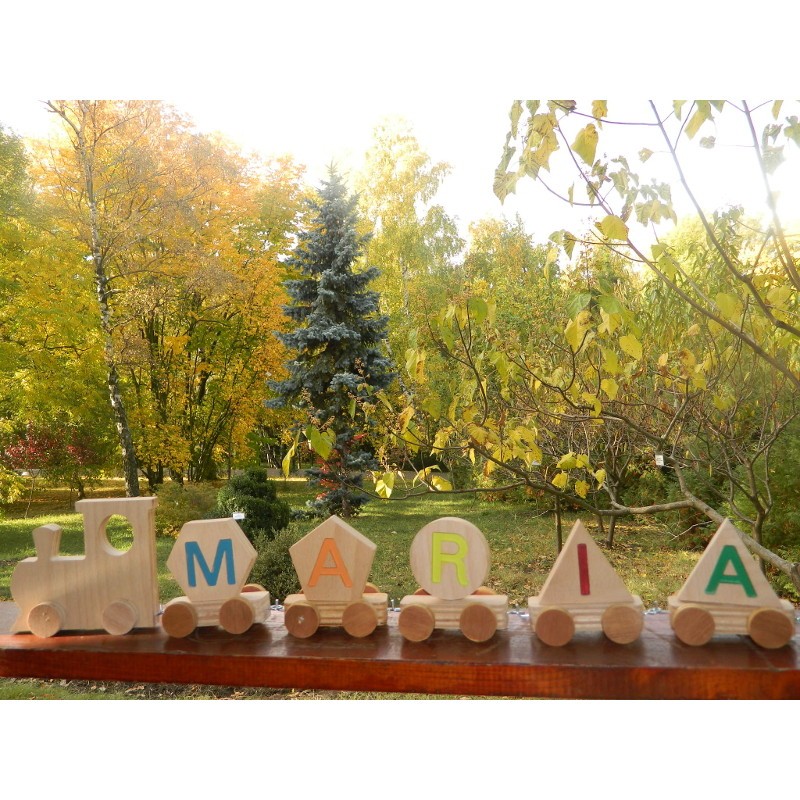 Acest tren din lemn personalizat cu numele copilului ajută copilul sa scrie și să pronunțe numele . Ajută la învățarea alfabetului. Copilul va fi încântat sa se joace cu acest tren!