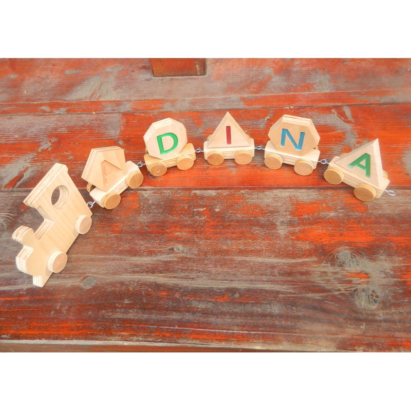 Tren din lemn personalizat cu numele copilului 5 litere