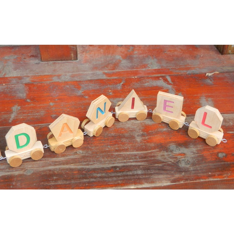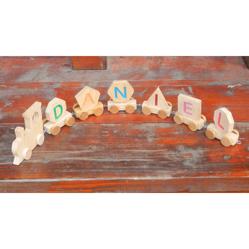 Acest tren din lemn personalizat cu numele copilului ajută copilul sa scrie și să pronunțe numele . Ajută la învățarea alfabetului. Copilul va fi încântat sa se joace cu acest tren!